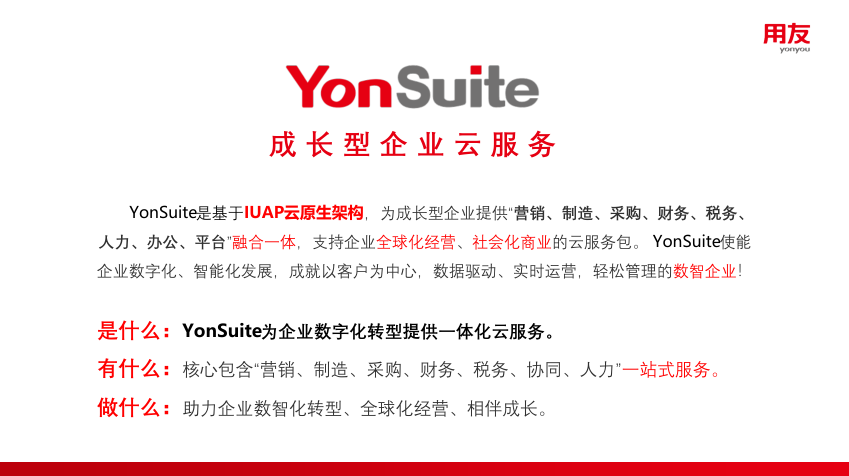 YonSuite是基于IUAP云原生架构,为成长型企业提供“营销、制造、采购、财务、税务、人力、办公、平台”融合一体,支持企业全球化经营、社会化商业的云服务包。YonSuite 赋能企业数字化、智能化发展,成就以客户为中心,数据驱动、实时运营,轻松管理的数智企业! 是什么:YonSuite为企业数字化转型提供一体化云服务。 有什么:核心包含“营销、制造、采购、财务、税务、协同、人力”一站式服务。 做什么:助力企业数智化转型、全球化经营、相伴成长。