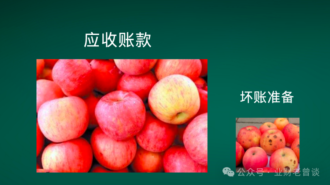 - 剩下的那些苹果,原来没有光泽、卖相不怎么好,经过一段时间收藏反而红通通、诱人可口,变成金苹果,于是就放回原来的苹果仓库,这就是坏账准备转回。