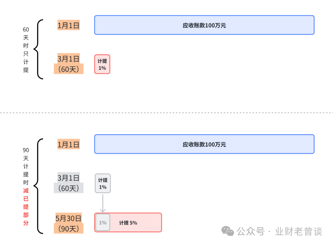 - 比如:甲公司2023年1月1日新增一笔应收账款计10万元,客户为乙公司,到3月1日账龄为60天,到5月30日账龄为90天,如果公司的坏账计提标准为“满60天计提1%,90天计提5%,180天计提15%,360天计提30%”,那在60天时计提1%,在90天时计提5%同时要冲销60天计提的1%,否则计提多了。