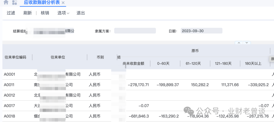 常见的ERP都有账龄统计功能,可以自动计算出账龄,如金蝶的星空、星辰,用友的BIP,还支持账龄分组,可直接查询或导出,如下图:坏账准备计提