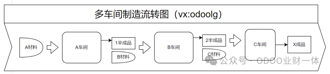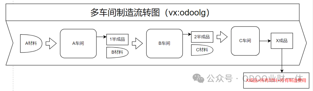 (以上为ERP系统截图) 例如:X成品,需要经过3个车间(A、B、C),每个车间有独立的设备,独立的管理人员,有不同的加工工序及耗用材料。如图: