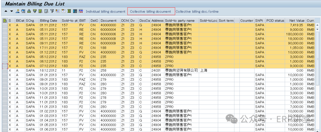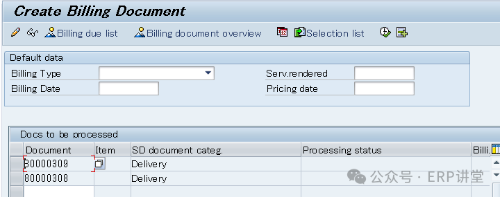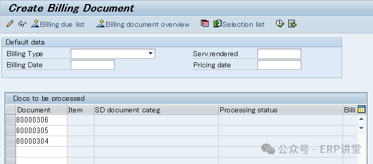 另一种是VF04,输入开票日期和其他一些可选筛选条件。系统会把符合开票日期范围的单据列出来。可以批量开票。