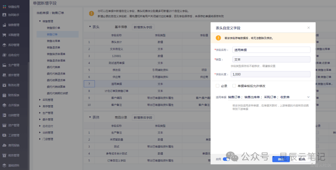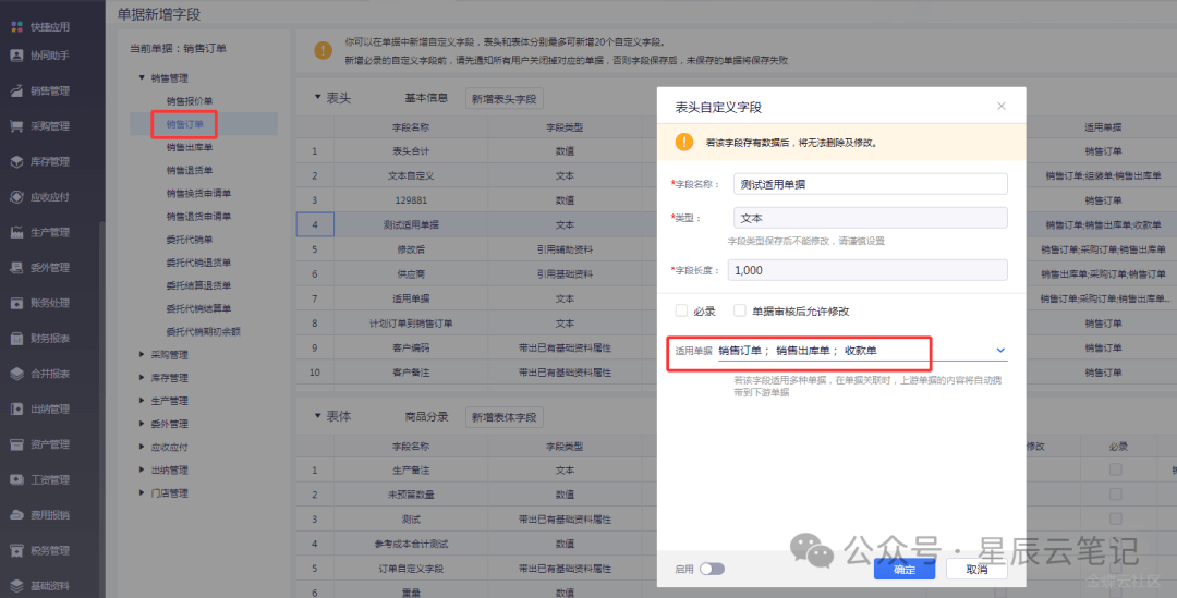 2、怎么设置单据自定义表头或表体资料? 【操作流程】 在单据自定义中设置自定义的字段,依次点击【系统设置】-【单据新增字段】,左边选择具体需要自定义的单据,比如销售订单,在点击中间“新增表头字段”、”新增表体字段“,新增后即可在单据中录入。