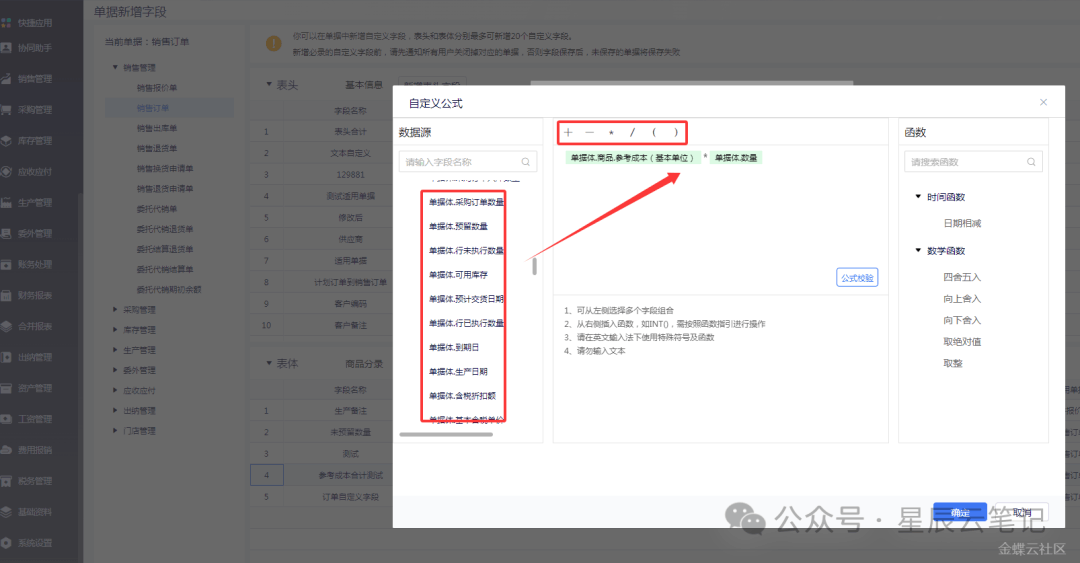 【解释说明】 (1)单据中自定义字段不支持参与单据里已存在的核算逻辑关系,比如在销售订单中新增一个“批发价”的字段,类型为“数值”,在编辑销售订单时这个“批发价”与销售订单中的数量、价税合计等字段没有计算关系,不会参与其他字段的核算。 (2)单据自定义字段最多支持新增20个。 3、单据表体新增自定义字段怎么设置公式? 【解决方案】 首先字段类型必须是数值型,然后点击设置公式,公式里面只能取到数值型的字段(自定义字段如果是数值型的也可以取到)