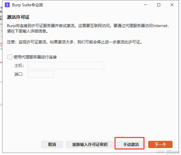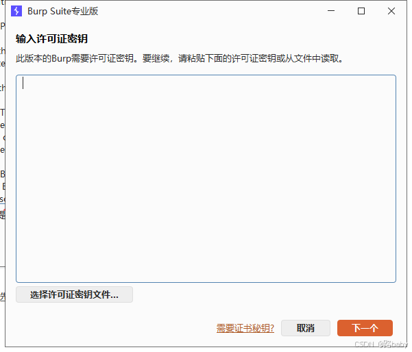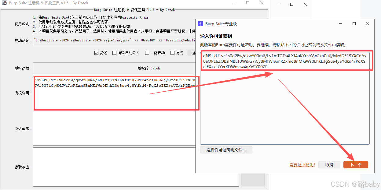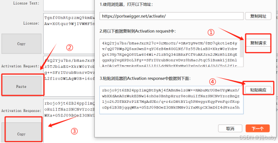随后按照下图步骤将burp第二步给的秘钥粘贴进注册机 并将注册机生成的最后的秘钥粘贴进burp  按照下图步骤进行 然后点击下一个