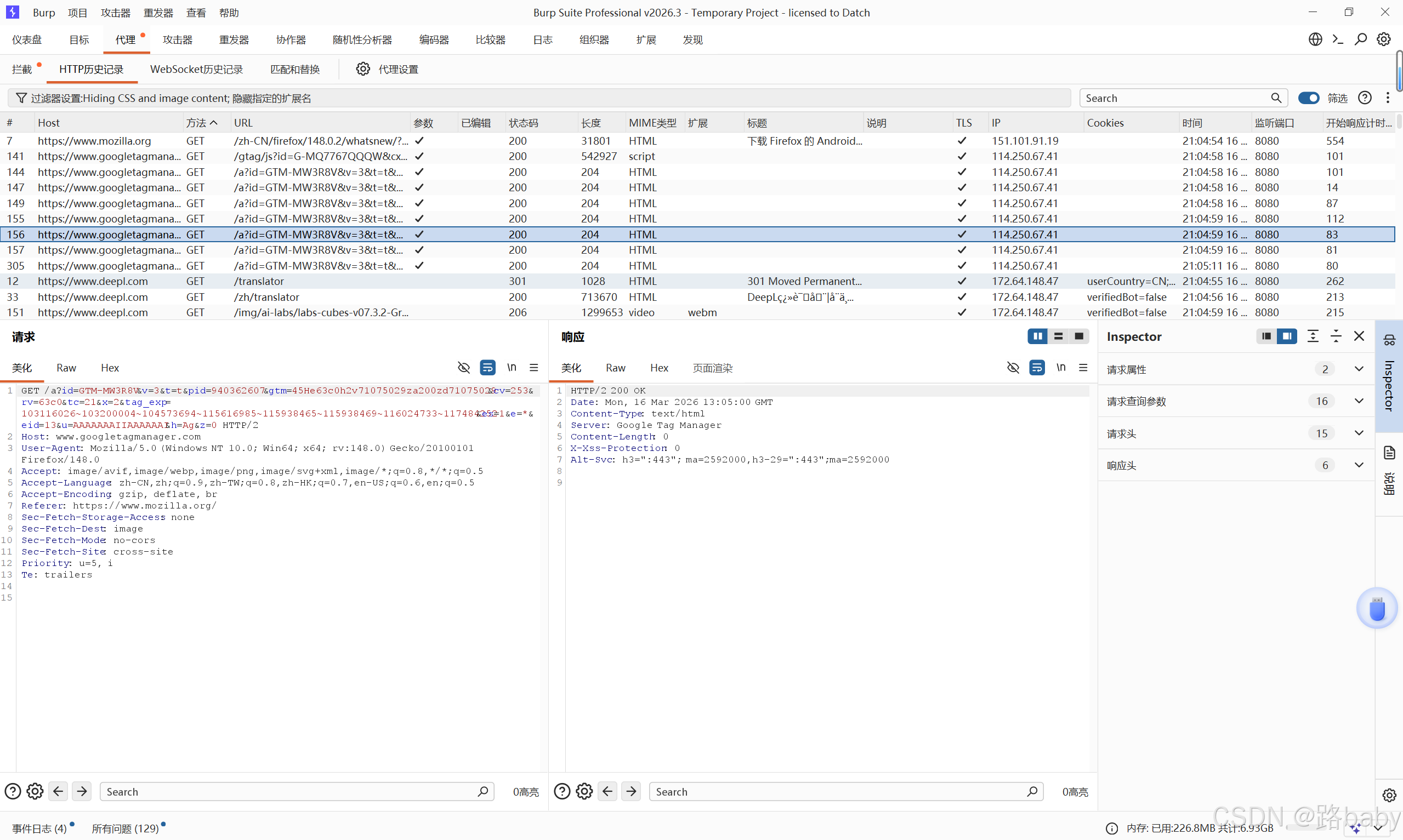 然后我们打开bP点击HTTP历史记录  就可以看到火狐发的请求包