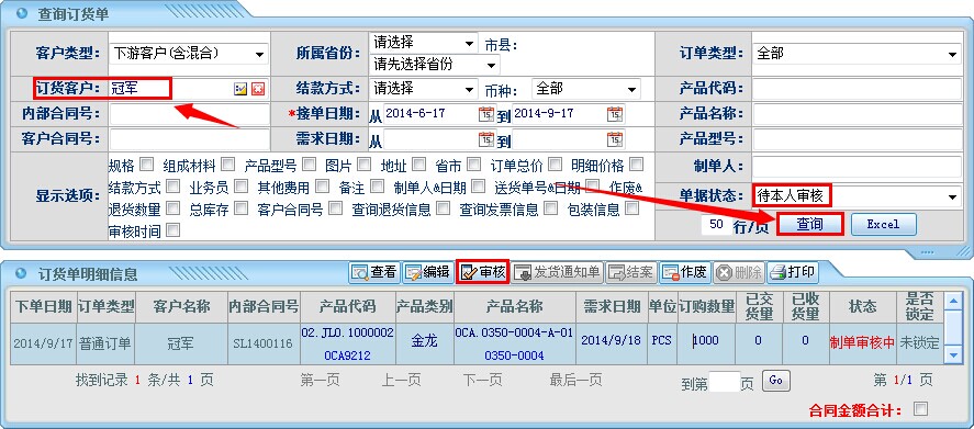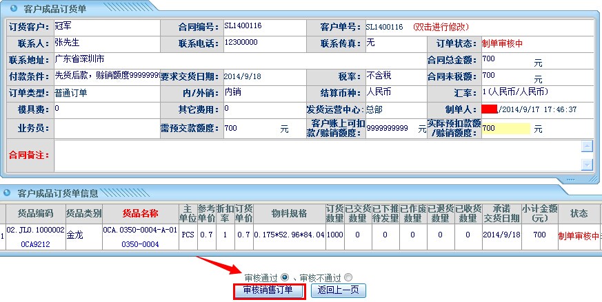 操作步骤:销售管理——销售订单管理——审核销售订单;进入页面如下图操作: