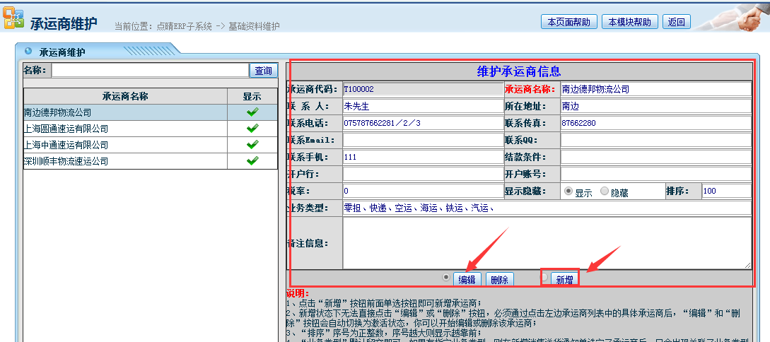 操作步骤:系统管理——仓库管理——承运商维护;如下图所示:可对承运商进行新增与编辑。