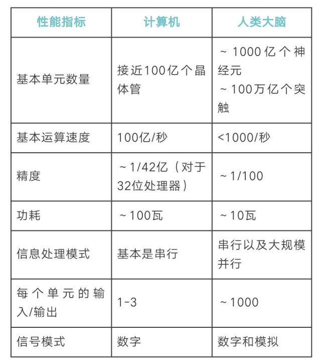 而人脑,由于生物噪声,神经系统中的大多数物理量,例如神经元发放率,只存在几个百分点的可变性,最好的情况下精确度能达到百分之一,仅是计算机的百万分之一。注:神经元发放率常被用来表征刺激强度。
