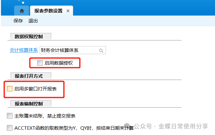 【操作说明】:当勾选【启用数据授权】时,才可以进行报表数据授权设置;当勾选【启用多窗口打开报表】时,打开多个报表时为多个窗口,一般在核对数据时使用。