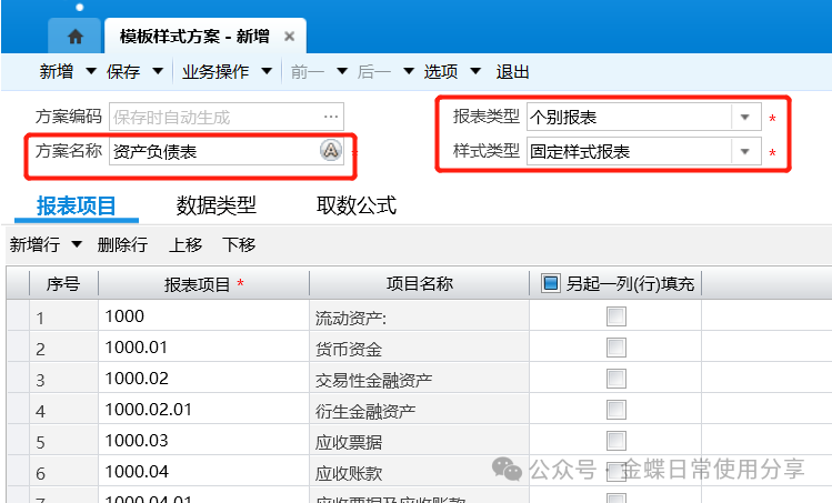 【业务场景】:在编制报表模板时可直接填充模板样式方案,因此可在方案中确定报表样式,填充的内容以及各表项的取数公式。该方案被保存和管理后,可方便灵活的用于后期任意报表的定义。