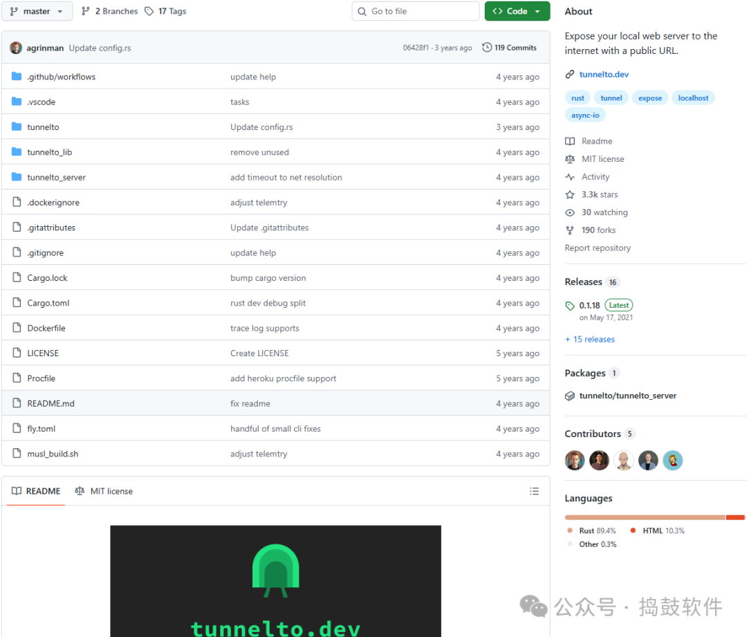 Tunnelto 是一个开源的内网穿透工具,由 Alex Grinman 使用 Rust 语言开发。它采用完全异步的架构,基于 Tokio 异步运行时构建,具有以下特点: